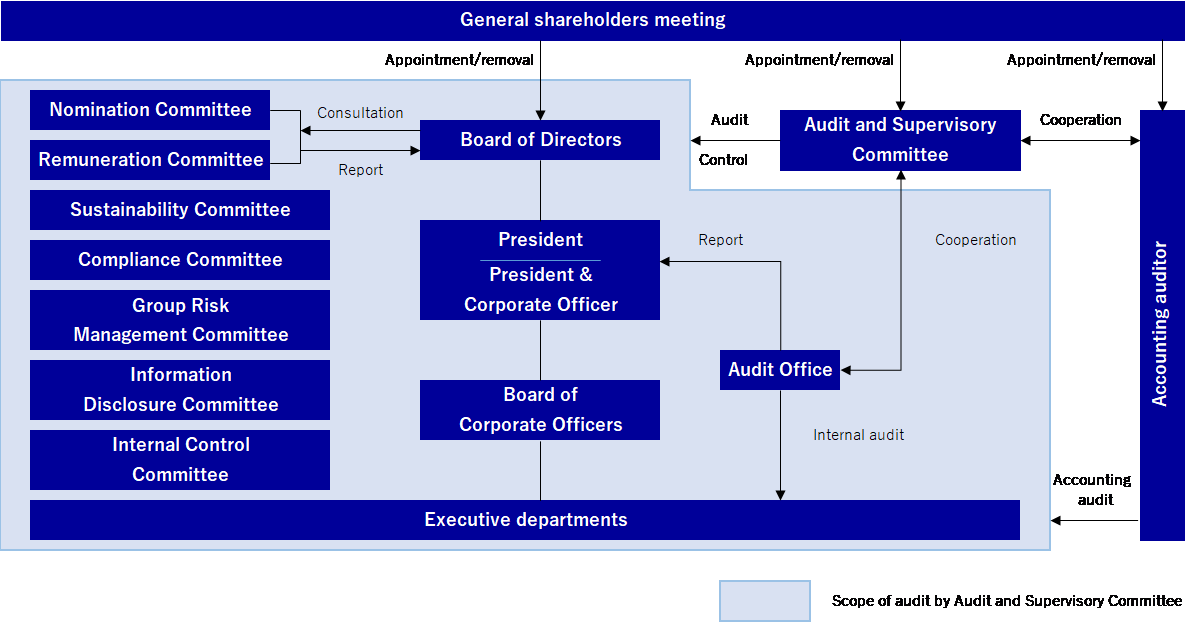 One of the most important issues the Company should tackle to ensure corporate soundness under the increasingly globalizing and significantly changing business environment is to enhance the business administration system and corporate governance from the shareholder-oriented point of view. In this context, it is our policy to establish good relations of trust with all the stakeholders and ensure timely and appropriate information disclosure and transparent management for efficient and sound business management based on the Management Philosophy.