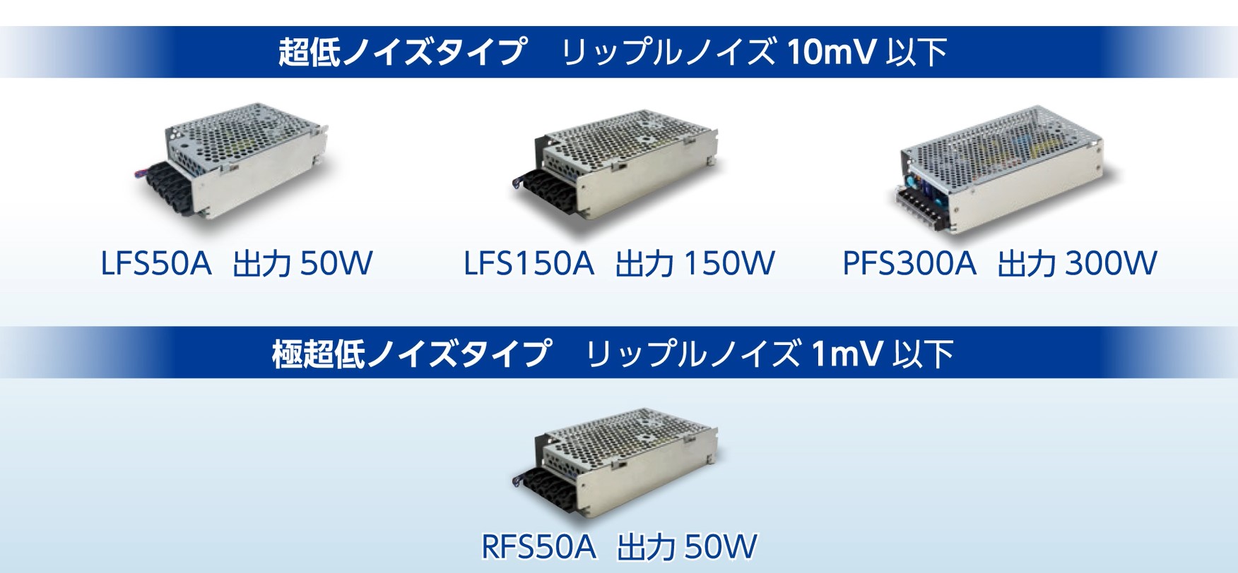 ダイトロン電源のラインアップは、リップルノイズが10mV以下の超低ノイズタイプ3機種と、その超低ノイズタイプをさらに低ノイズ化したリップルノイズが1mV以下の極超低ノイズタイプがあり、ニーズに合わせてノイズ性能を選ぶことができます。