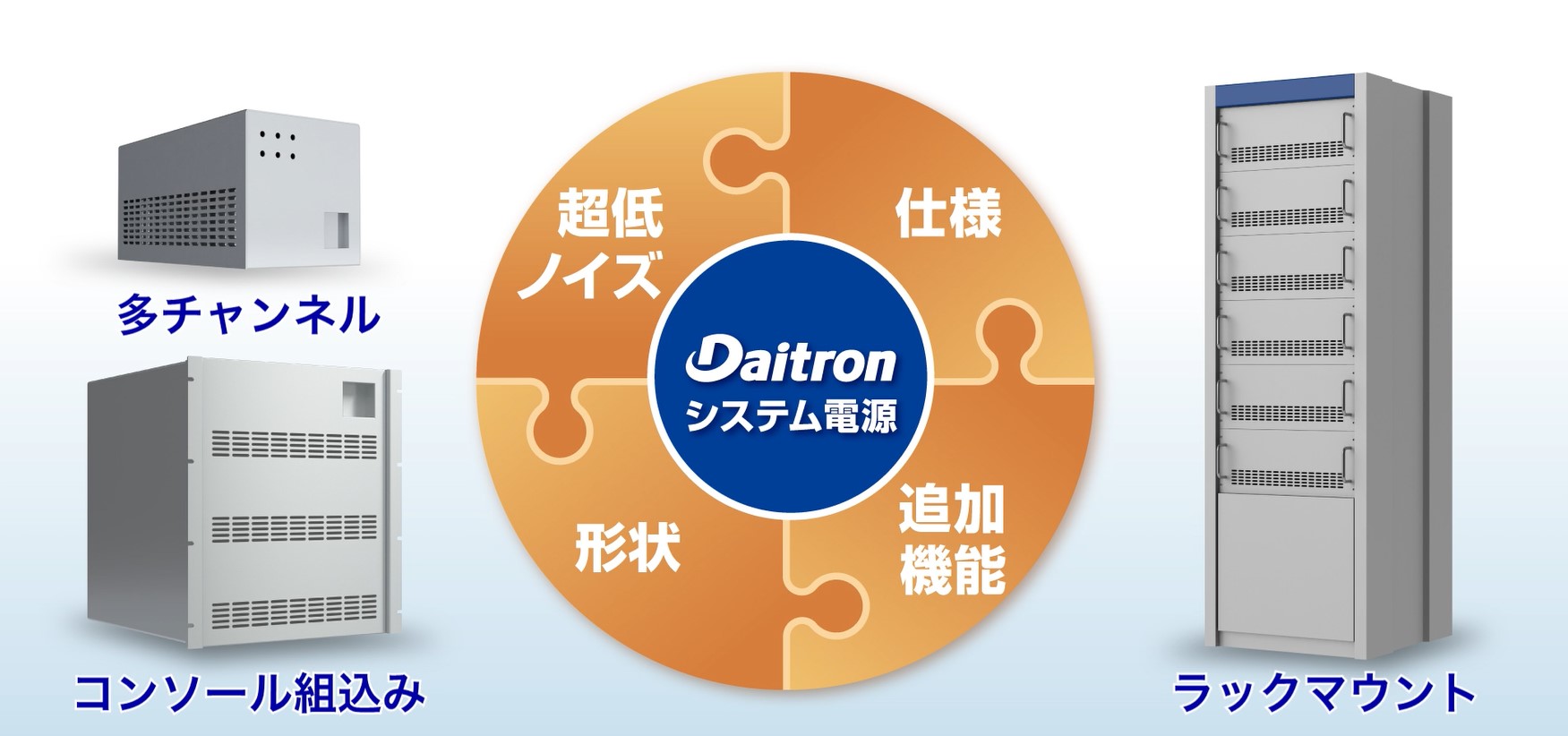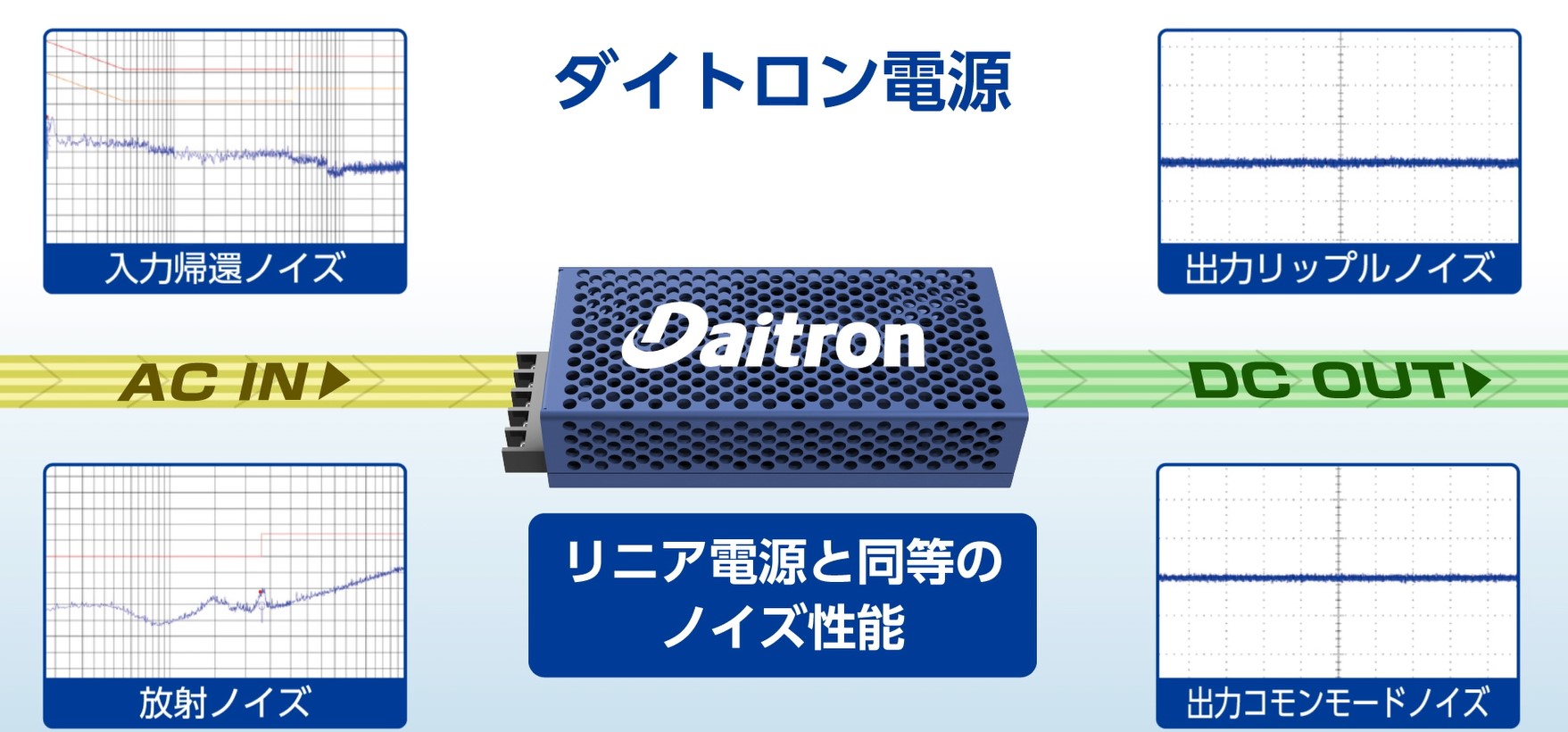 電源事業で培ってきた独自の技術で超低ノイズ性能を実現し、さらにコンパクトで軽量・安全性・設計効率に優れたダイトロン電源。その他、豊富な取り扱い商品により、最適なソリューション提案であらゆるニーズに貢献します。