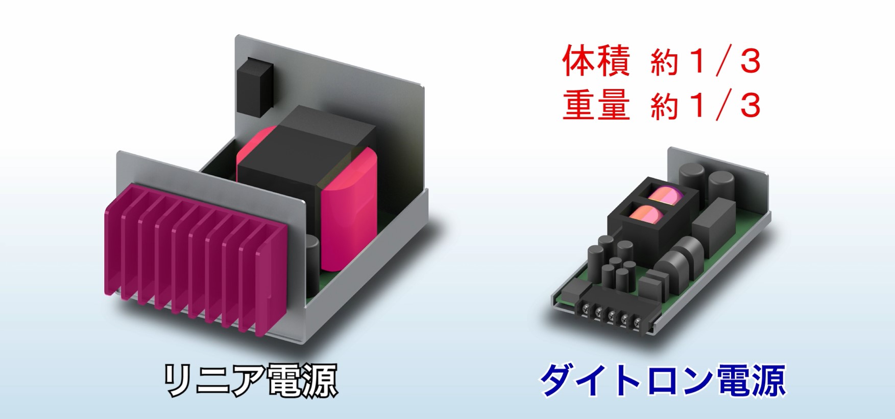 ダイトロン電源は、必要な電圧に応じて高周波パルス制御を行い、トランスを小型・軽量化しています。また、リニア電源に比べ変換効率が80~90%と高く、放熱も抑えられます。