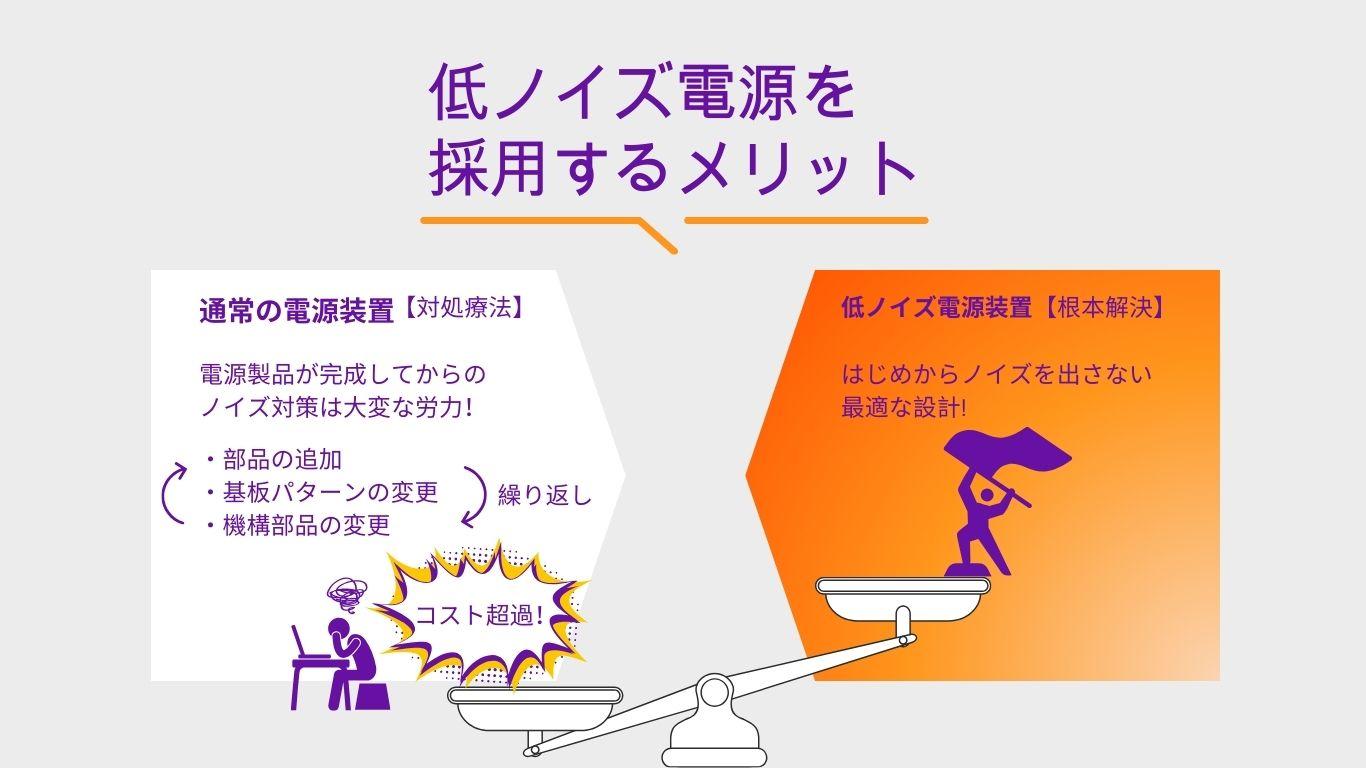 当社は上記の課題を解決すべく、低ノイズ・小型・軽量・高効率のスイッチング電源を製品化しました。ノイズを少しでも抑えたいアプリケーションに最適です。