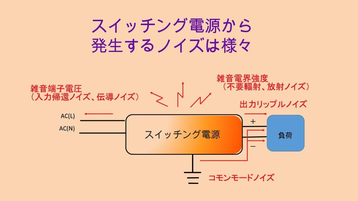 一般的なスイッチング電源は、スイッチング素子のON/OFF時に電圧と電流が急激に立ち上がり(立ち下がり)ます、その際にリンギングと呼ばれる波形が発生します。