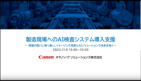 第3部 15:00~15:30 『製造現場へのAI検査システム導入支援 ~現場の想いに寄り添い、イメージング技術とAIソリューションで未来を拓く~』 (発表者)キヤノンITソリューションズ(株) 高見澤 亮 様 |