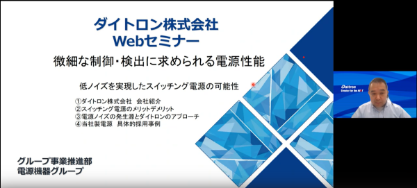 第1部 13:30~14:00 低ノイズを実現したスイッチング電源の可能性 (発表者) ダイトロン(株) 齋藤 孝路 |