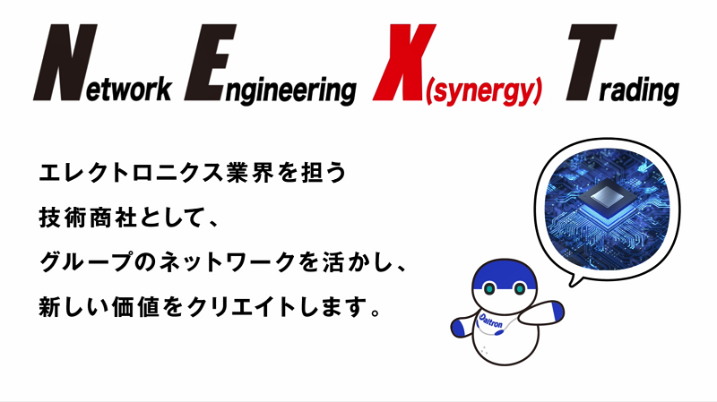 「次」を意味する"NEXT"には、" NETWORK ENGINEERING X[SYNERGY] TRADING"の意味を込めました。エレクトロニクス業界を担う技術商社(Engineering Trading Company)として、グループのネットワーク(Network)を活かし、新しい価値をクリエイトします