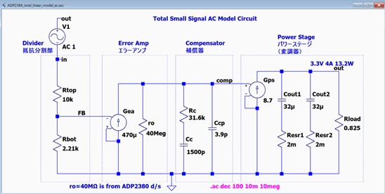 基本的な電力段の設計(出力電圧設定、Fsw, L, Cの選定等)等が正しく終わっている事とLTspiceツールの基本的な使用法を知っている事を前提としています。小信号ACモデルを基に検討・計算・設計を行い、最後に過渡(時間)解析でも位相・利得余裕のFRAシミュレーションと負荷過渡応答の検証を試みます。