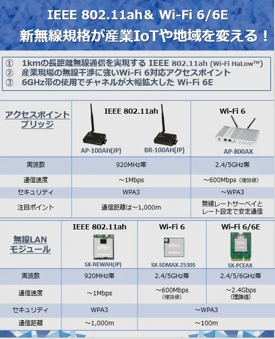 2022年9月に国内利用が可能になった無線LAN規格のWi-Fi 6Eと1kmの長距離通信が可能なIEEE 802.11ah。