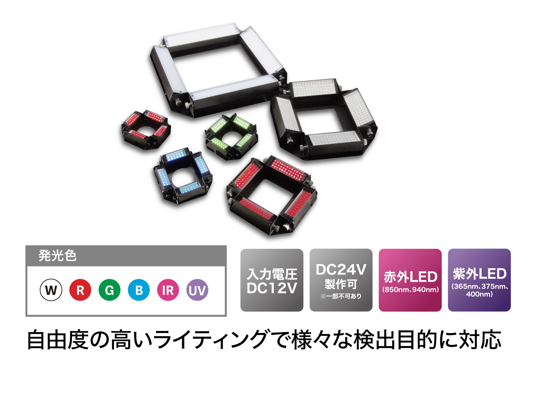 白・赤・緑・青・赤外(850nm、940nmなど)・紫外(365nm、375nm、400nmなど)色を標準で揃えています。検査対象や目的に応じた発光色の選択にもすぐ対応できます。赤外光・紫外光は発光波長をお選びいただけます。