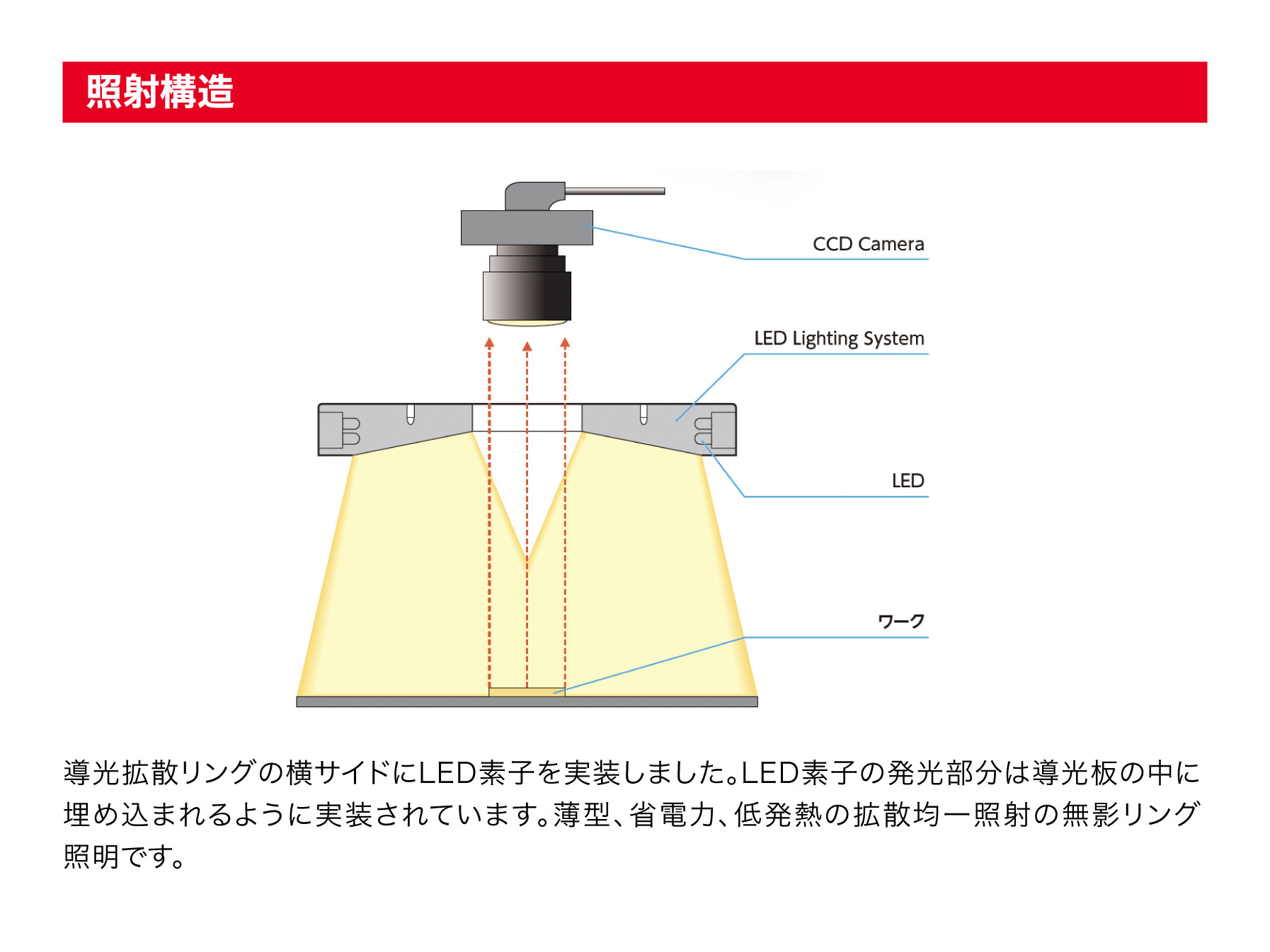 傾斜角がついた導光拡散リングからのやわらかい光が金属表面などワークへの写り込みを防止します。