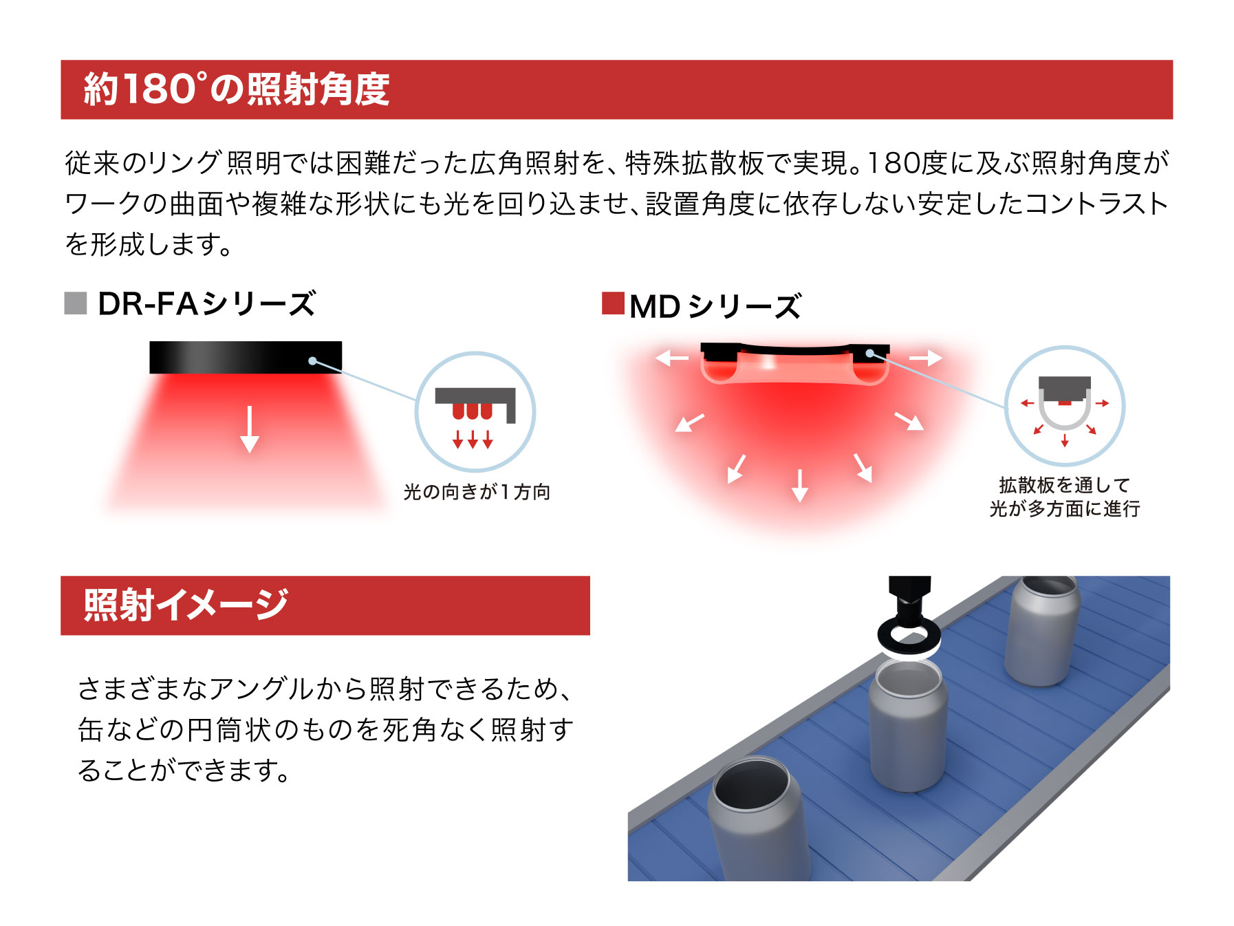 約180度に及ぶ照射角度で、従来のリング照明では届かなかった部分まで広く、死角なく照射できます。