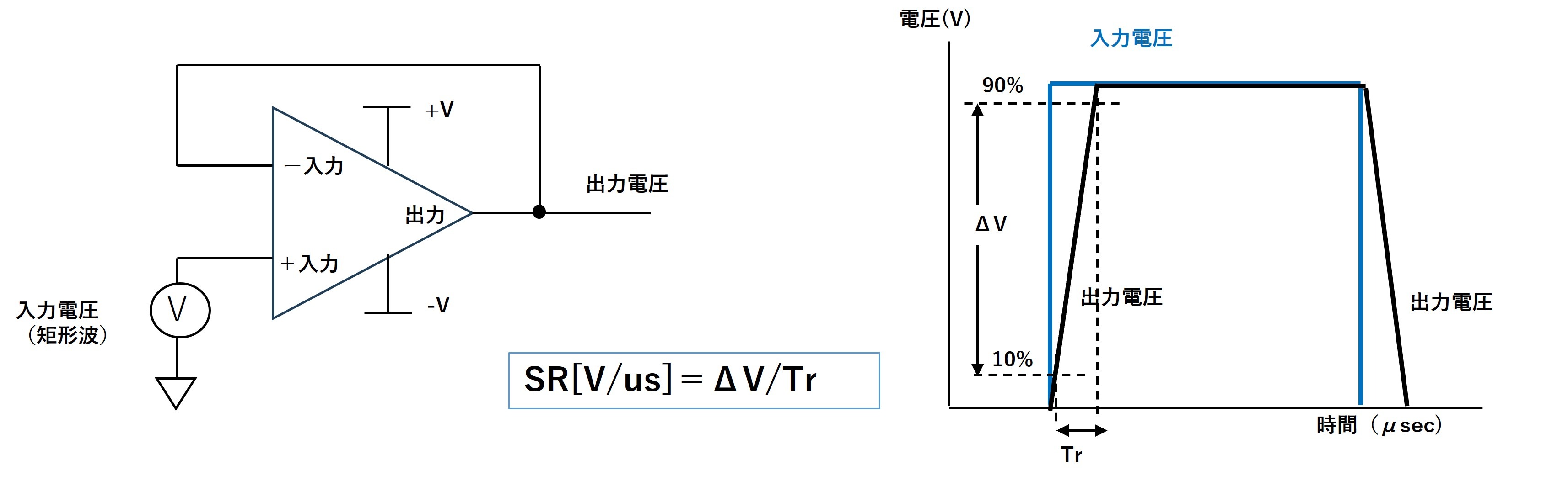 ペアンプのスルー・レート(slew rate:SR)は大振幅(※)における出力電圧の最大変化率のことで、通常はV / μsで表されます。スルー・レートが高いほど入力に対する追従性が良くなります。
