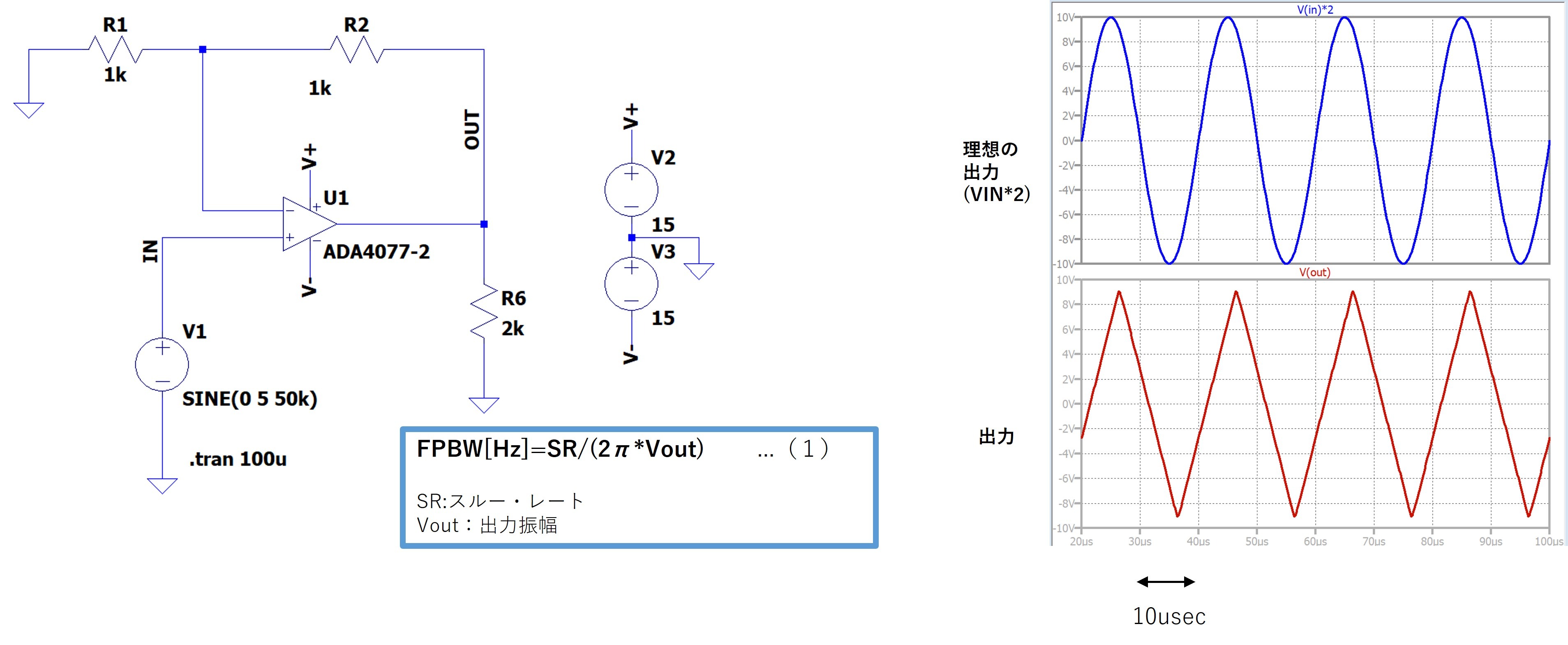 ADA4077のスルー・レートはデータシートで1.2V / μsになっています。出力10Vpeakを見るためには(1)式よりパワーバンド幅=19kHzとなります。わかりやすくするため50kHz、入力5Vpeakとし、2倍の非反転アンプでシミュレーションしてみました。波形が三角になり歪むことが分かります。