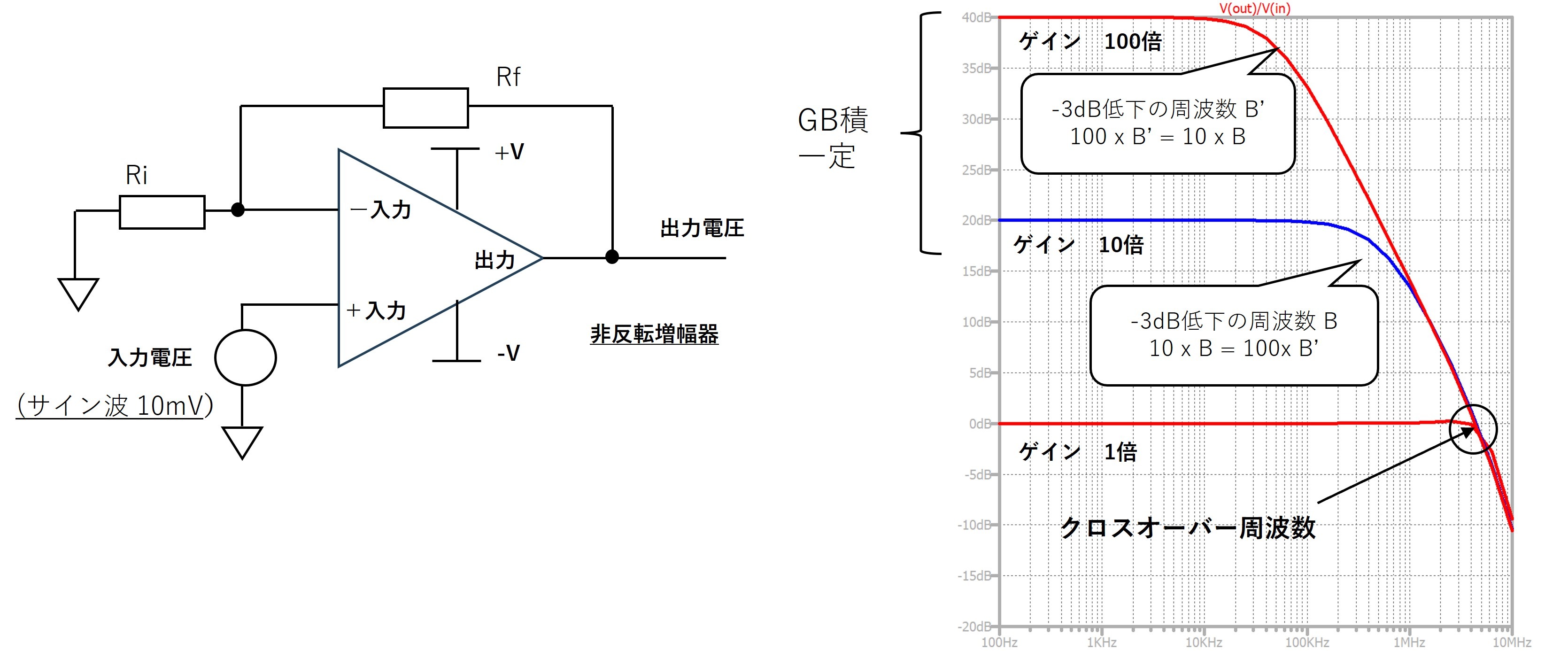 - ゲインGが設定値より-3dB低下する周波数をBとすると、ゲインGとBの掛け算G×Bは一定となり、これをGB積と呼びます