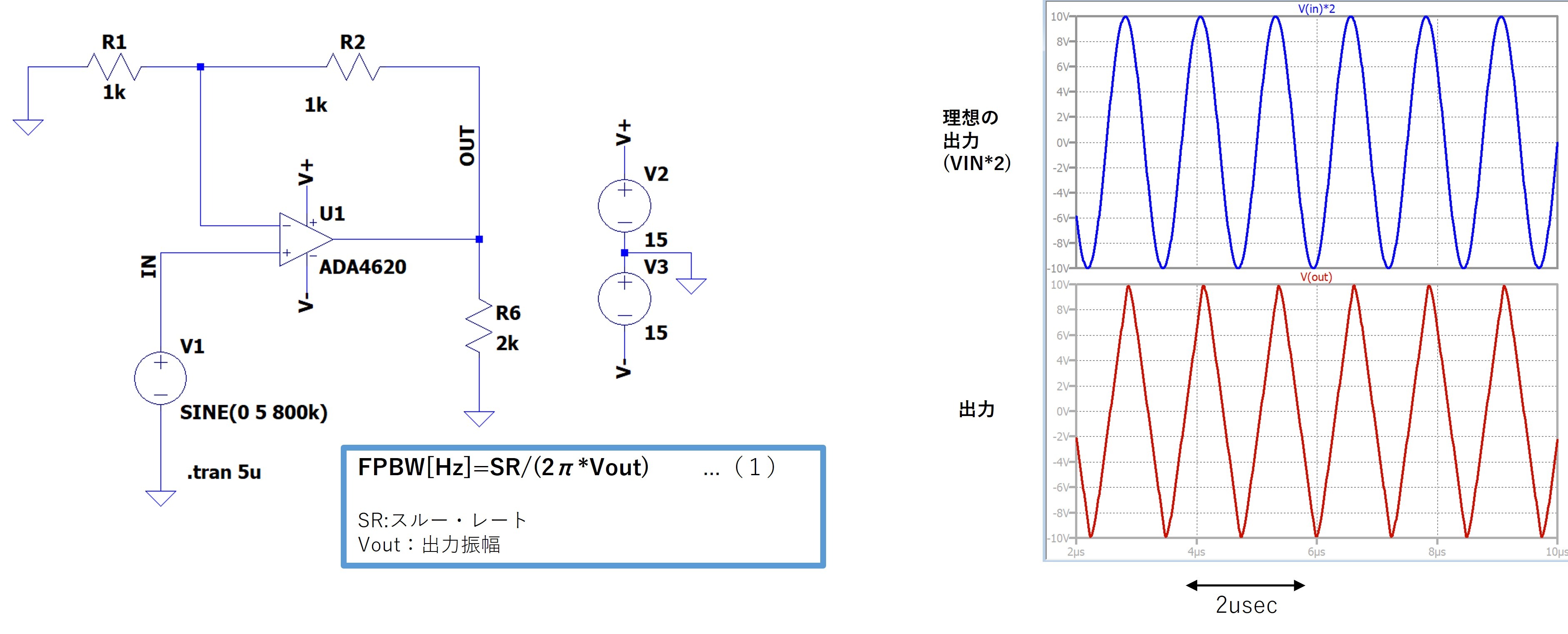 波形が歪まずに増幅できる限界周波数は、スルー・レートと振幅により決まり、その関係式を(1)に示します。この限界の周波数をFPBW(full Power Band Width):パワーバンド幅と呼びます。
