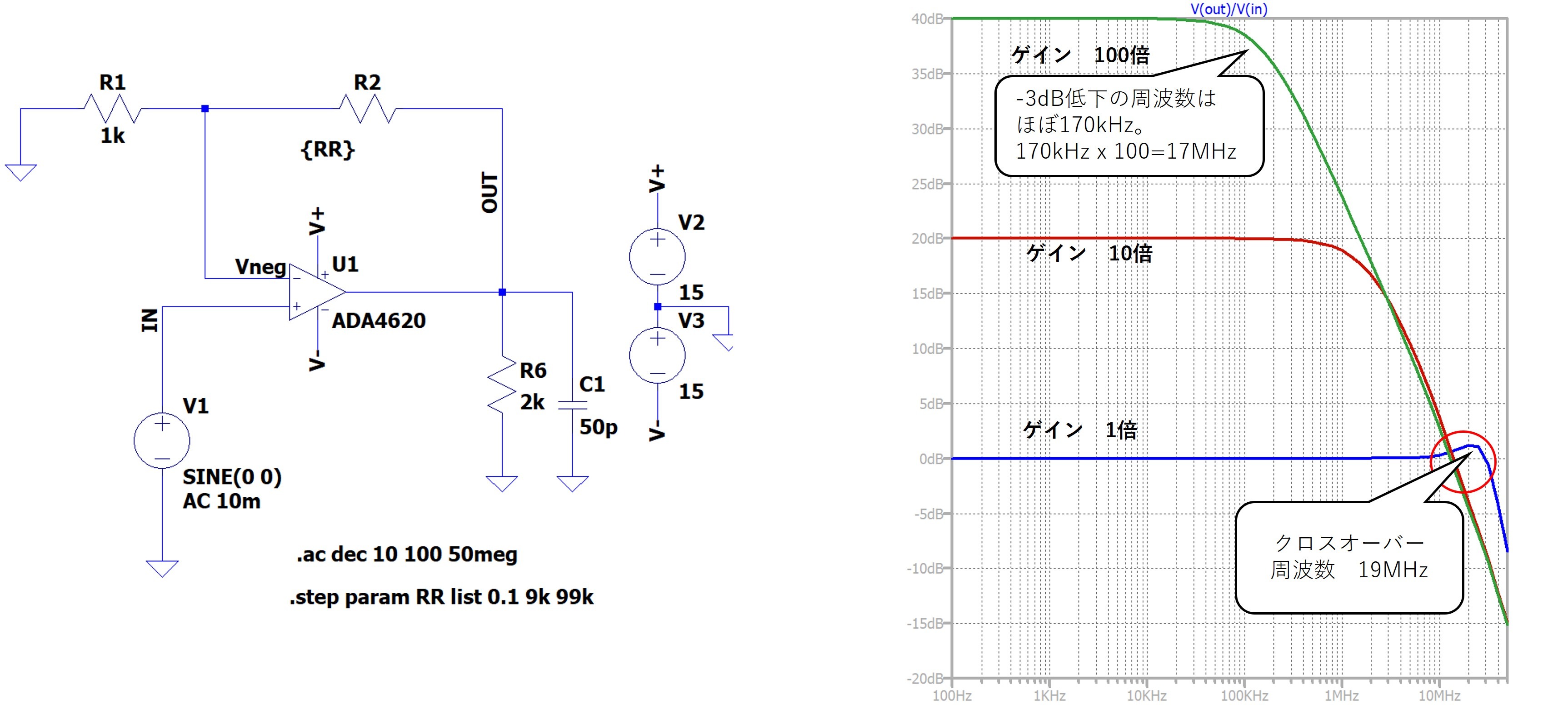 シミュレーションの結果、クロスオーバー周波数は、19MHzとなり、データシート記載18MHzとほぼ一致しました。