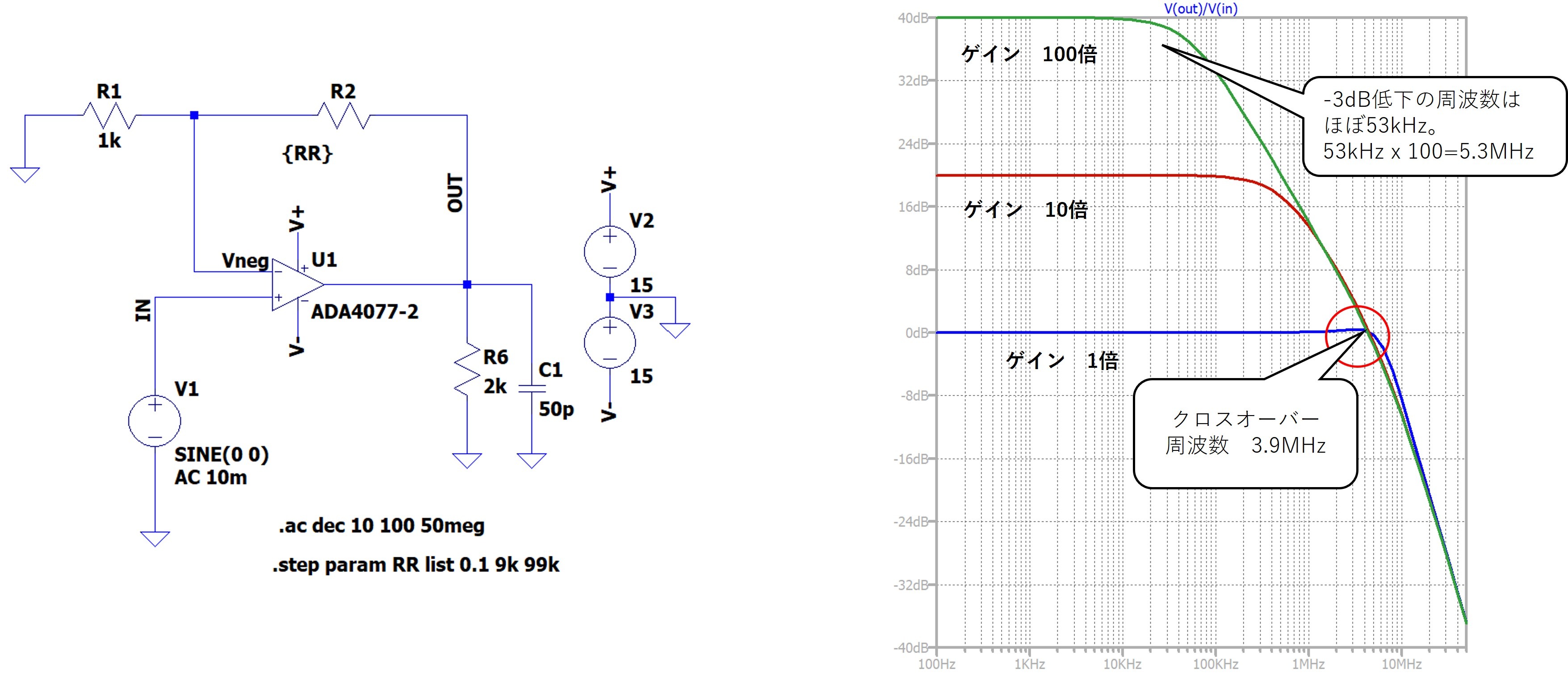 シミュレーションの結果、クロスオーバー周波数は、ほぼ3.9MHzとなり、データシート記載の3.9MHzと合致しました。