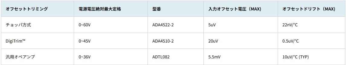 データシートの入力オフセット電圧、オフセットドリフトを汎用オペアンプと比較し下記にまとめます。チョッパ方式やDigiTrim™が従来の汎用オペアンプと比べ、桁違いに優れた性能を持つことが分かります。