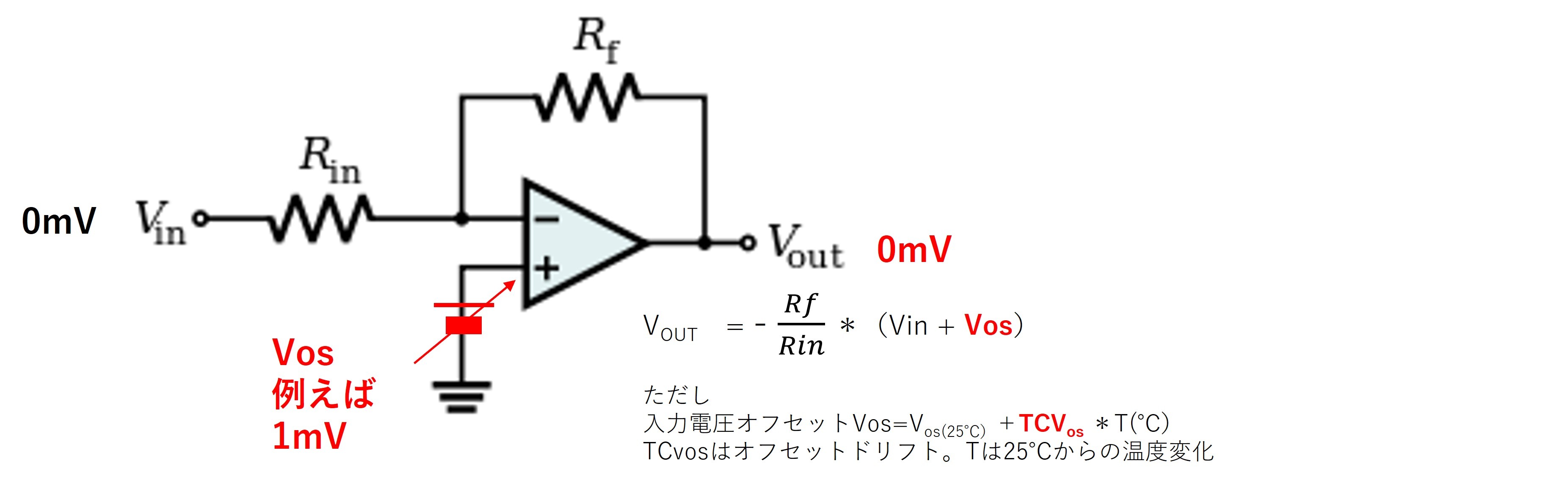 入力オフセット電圧とは、入力がゼロの時にオペアンプの出力VOUTをゼロにするために必要な入力電圧です。