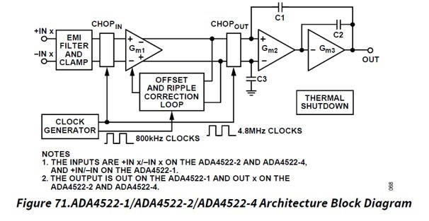ADA4522-2は差動入力を高い周波数(4.8MHz)をチョッピングしてオフセットを高周波へ追いやったのちに800kHzのローパスフィルタで4.8MHzの高周波ノイズを除去することで極めて小さいオフセット電圧/ドリフトを得られています。