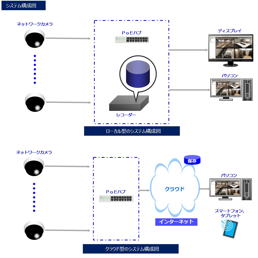 システムはレコーダを設置する「ローカル型」やインターネットを利用する「クラウド型」があります。